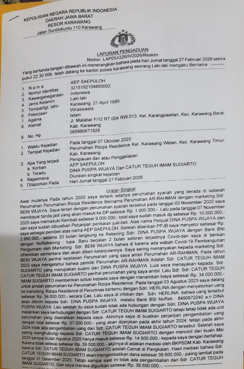 Aep mengaku menjadi korban dugaan penipuan terkait janji pembangunan Perumahan Arrahman sejak 2020. Ia menyebut telah menandatangani Perjanjian Pengikatan Jual Beli (PPJB) dengan Dina Puspa Wijaya selaku pihak penjual, sekaligus istri Catur Teguh Imam Sugiarto, serta telah menyetorkan uang muka pembelian rumah.