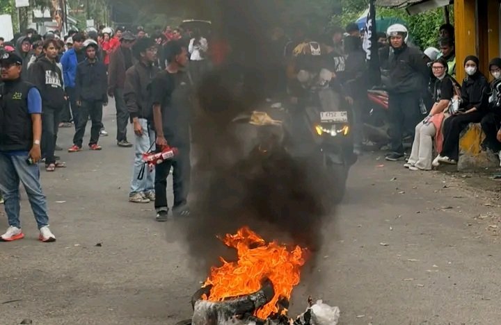 Di sejumlah titik sepanjang jalur tersebut, massa melakukan aksi pembakaran ban di badan jalan sebagai bentuk protes. Asap hitam membumbung ke udara dan sempat mengganggu arus lalu lintas, sehingga menarik perhatian pengguna jalan dan warga sekitar.