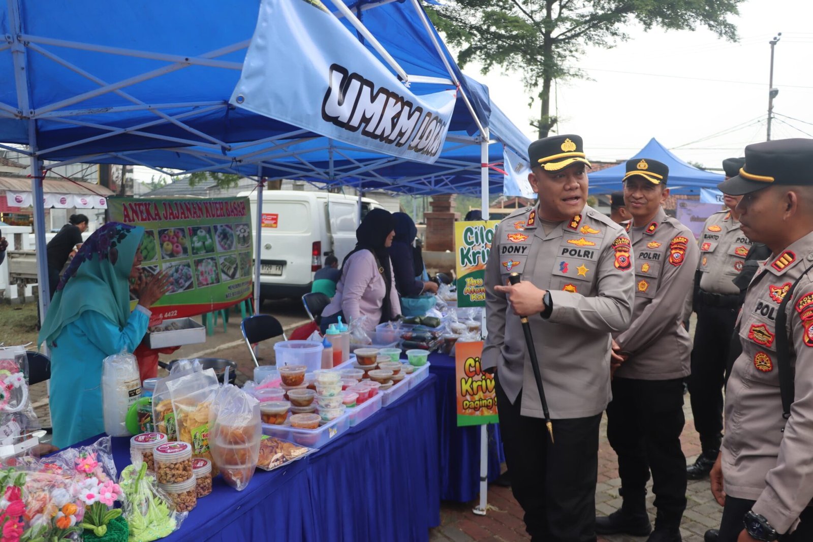 Usai zoom meeting, Kapolres Subang bersama pejabat dan instansi terkait meninjau stan Gerakan Pangan Murah untuk memastikan distribusi bahan pokok berjalan lancar dan masyarakat dapat membeli kebutuhan pangan dengan harga lebih rendah dibanding harga pasar.
