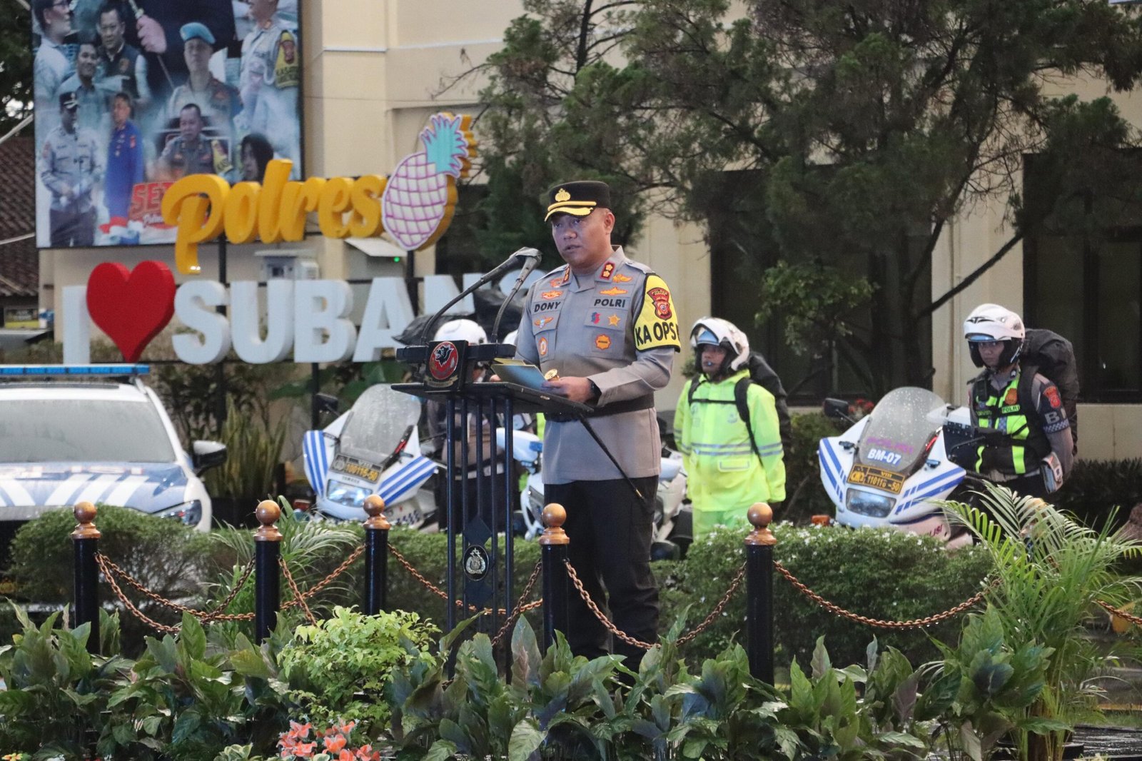 Kegiatan apel dipimpin langsung oleh Kapolres Subang AKBP Dony Eko Wicaksono, S.H., S.I.K., M.H., Ph.D. dan dihadiri unsur Forum Koordinasi Pimpinan Daerah (Forkopimda) Kabupaten Subang serta sejumlah instansi terkait, di antaranya perwakilan DPRD Kabupaten Subang, Lanud R. Suryadi Suryadarma, Kodim 0605 Subang, Yonif 312 Kala Hitam, Kejaksaan Negeri Subang, Pengadilan Negeri Subang, Satpol PP, Dinas Perhubungan, serta unsur TNI-Polri dan stakeholder lainnya.