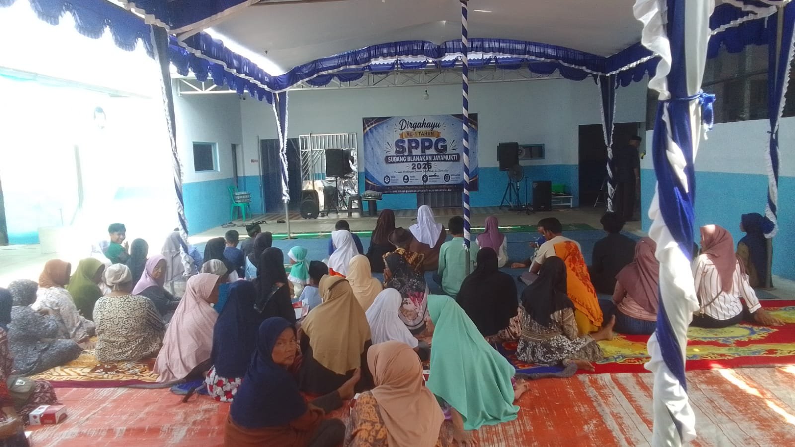 Sejumlah warga menghadiri peringatan hari ulang tahun ke-1 Satuan Pelayanan Pemenuhan Gizi (SPPG) Desa Jayamukti, Kecamatan Blanakan, Kabupaten Subang, Sabtu (25/4/2026). (Foto: subangpost.com/Zein)