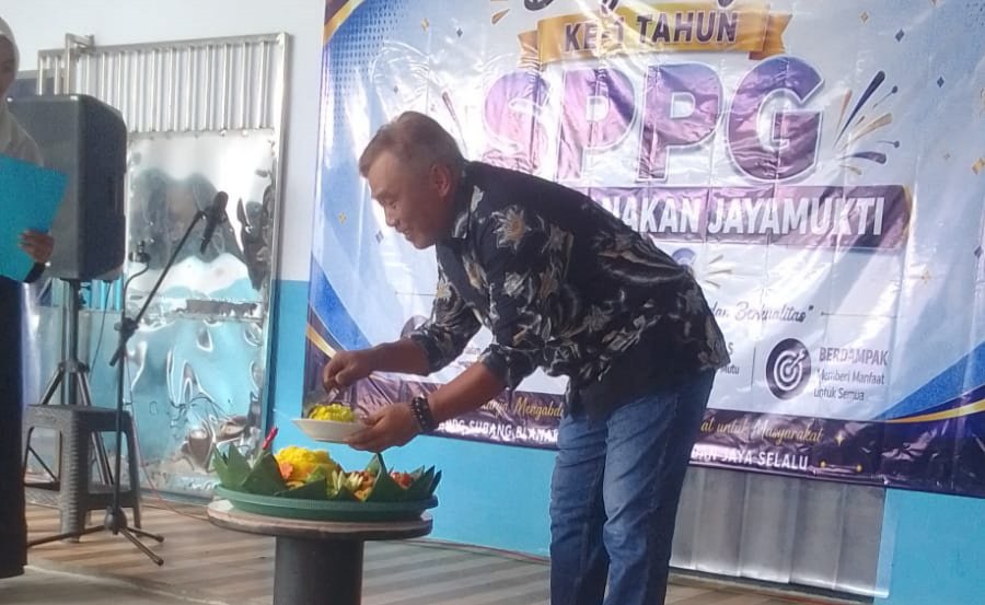 Kepala Desa Jayamukti, Surjaya, melakukan pemotongan tumpeng dalam rangka peringatan hari ulang tahun ke-1 Satuan Pelayanan Pemenuhan Gizi (SPPG) Desa Jayamukti, Kecamatan Blanakan, Kabupaten Subang, Sabtu (25/4/2026). (Foto: subangpost.com/Zein)